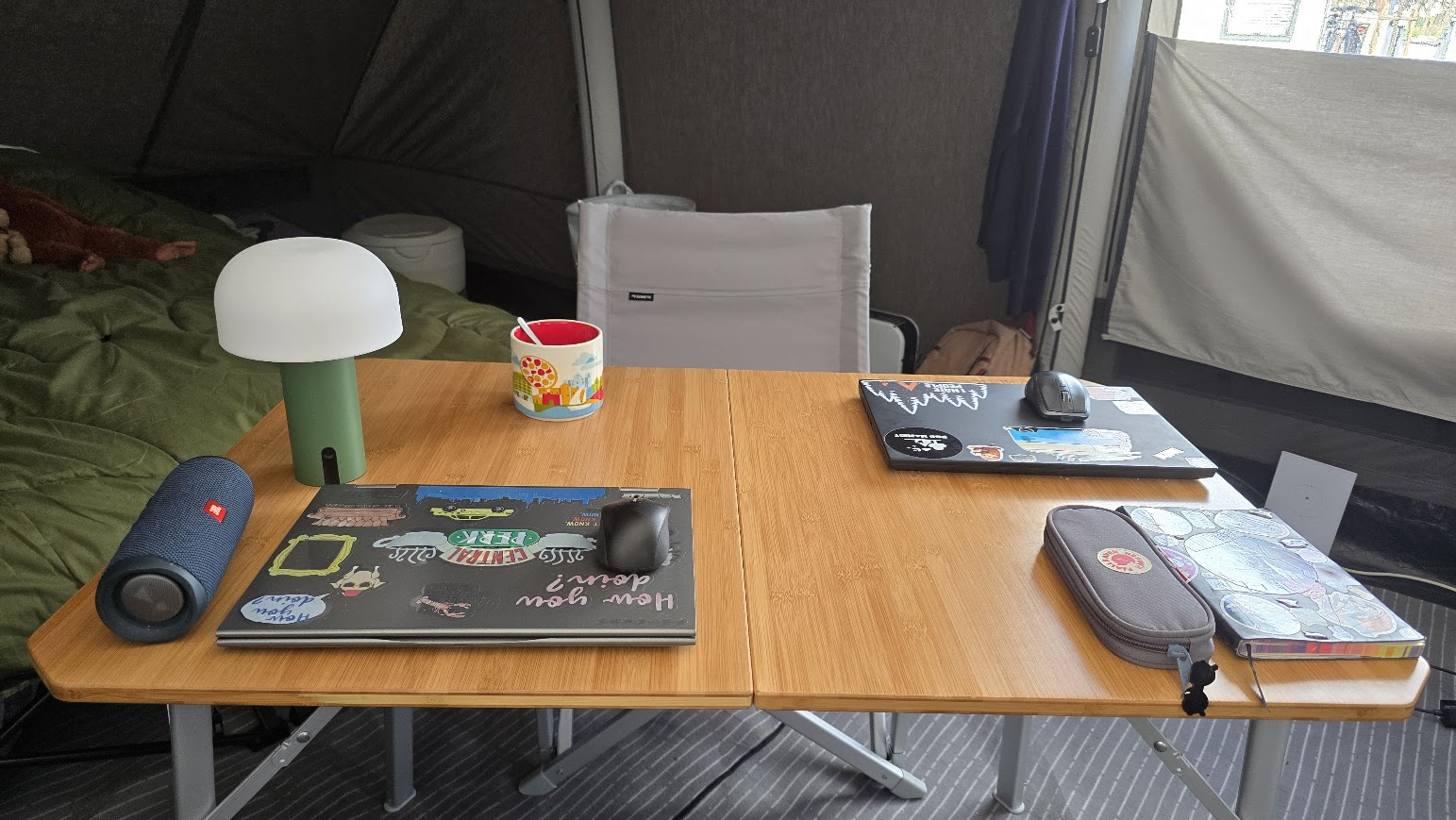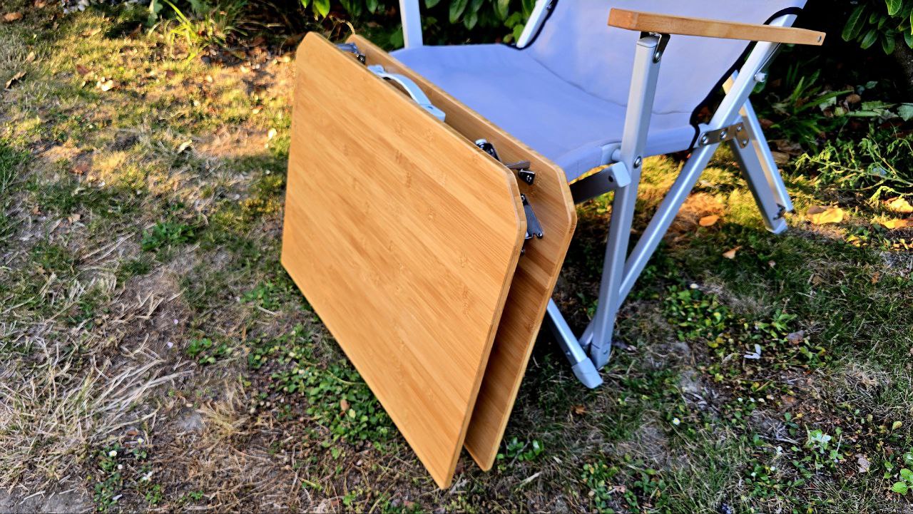 Zacznijmy od stołu. Już sama jego nazwa zdradza, że nie mamy do czynienia z byle czym. Blat z bambusa nie tylko wygląda elegancko, ale też świetnie znosi campingowe realia – jest wodoodporny, łatwy do przetarcia, odporny na temperatury i warunki atmosferyczne. Można na nim gotować, rozlewać, pracować i jeść świąteczne śniadanie pod namiotem – sprawdzone w praktyce! 😄