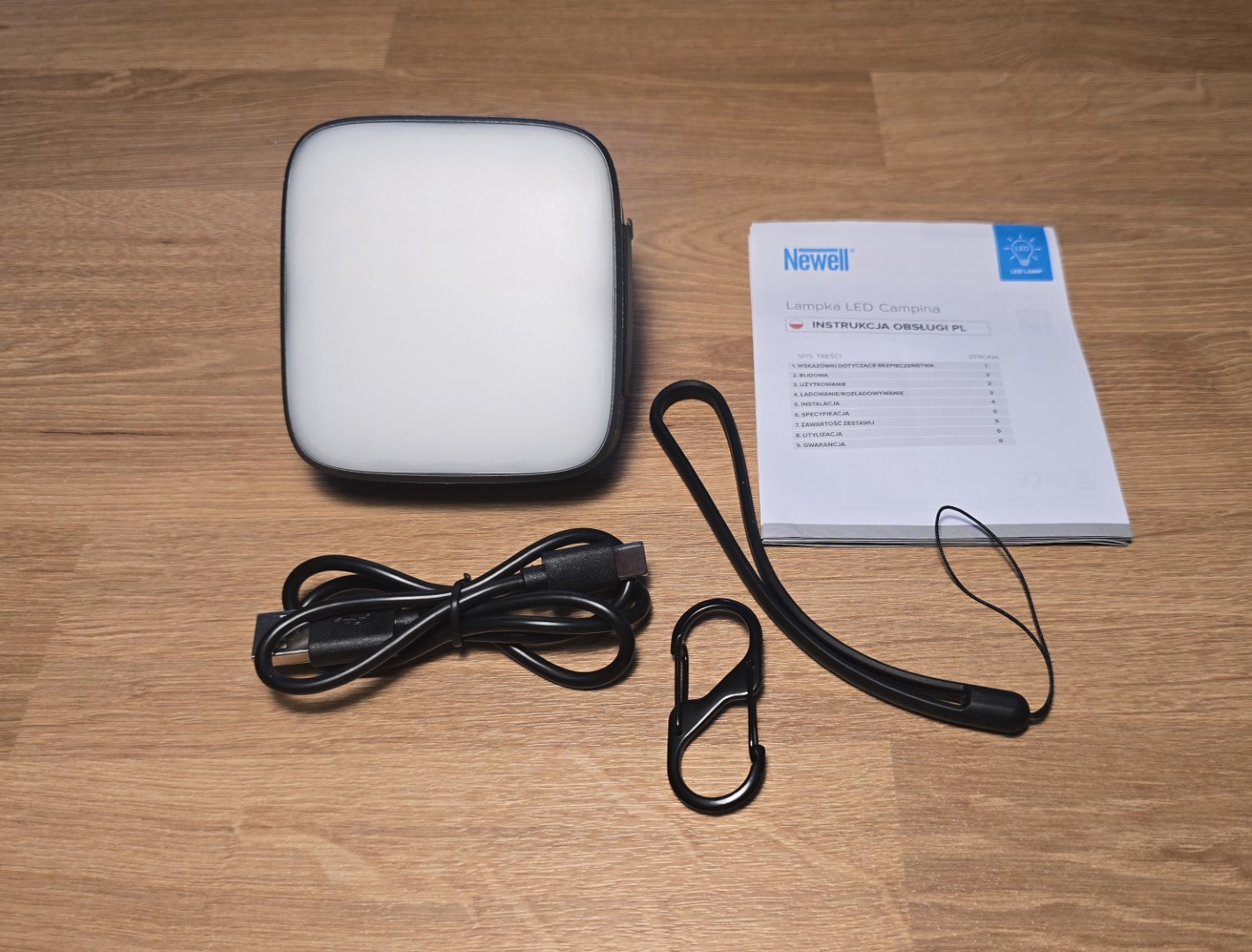 W zestawie znajduje się również karabińczyk. To niewielki dodatek, ale niezwykle praktyczny — pozwala błyskawicznie zawiesić lampkę tam, gdzie akurat jest miejsce. Nie trzeba kombinować z supłami ani pętelkami.